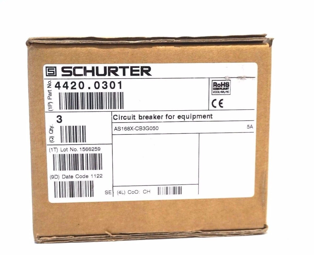 3 NEW SCHURTER AS168X-CB3G050 CIRCUIT BREAKER 4420.0301 AS168XCB3G050 (1 BOX OF 3 PCS.)