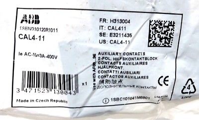 6 NEW ABB CAL4-11 AUXILIARY CONTACT CAL411$75.00 Out of stock SKU: 173585080065 Category: Other Description Additional information Description 6 NEW ABB CAL4-11 AUXILIARY CONTACT CAL411 2074 RB Additional information Weight 1.00 lbs MPN CAL4-11 Brand ABB Country/Region of Manufacture Czech Republic We Buy New and Used Surplus Inventory - Sell to Us