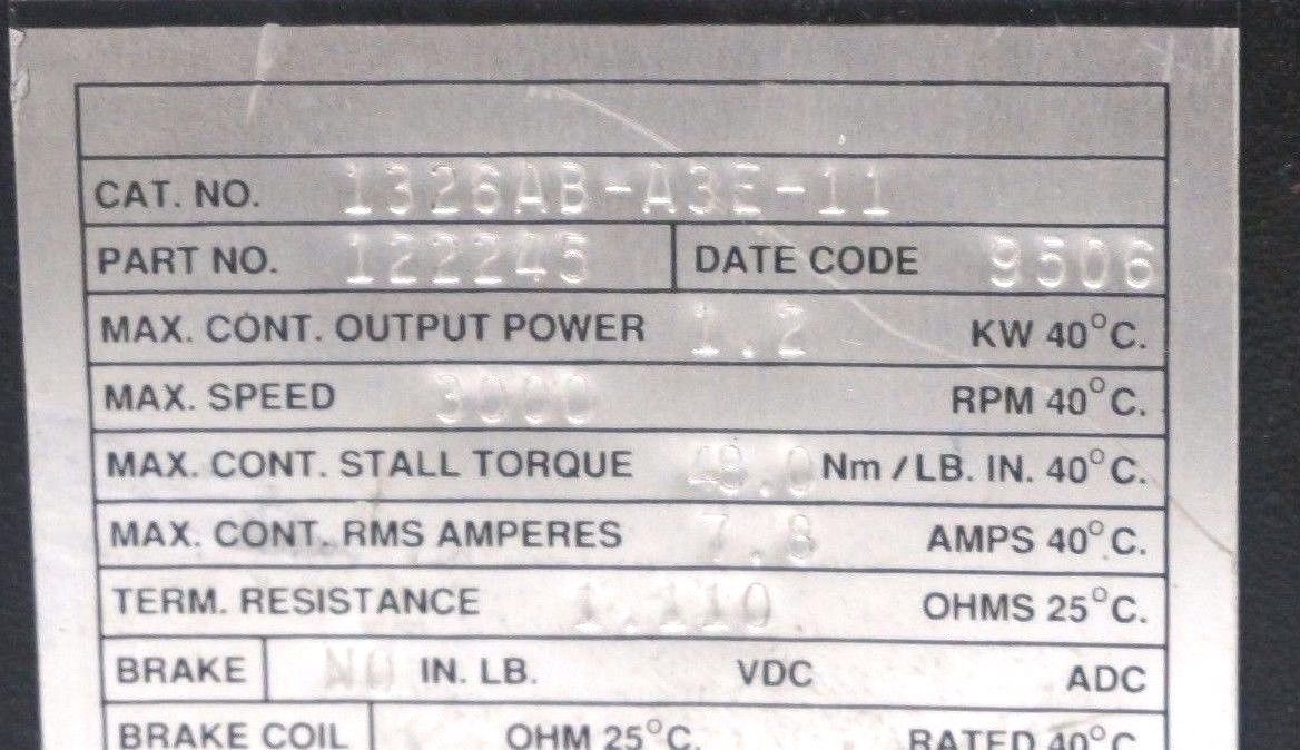 ALLEN BRADLEY 1326AB-A3E-11 SERVO MOTOR 122245, 1326ABA3E11