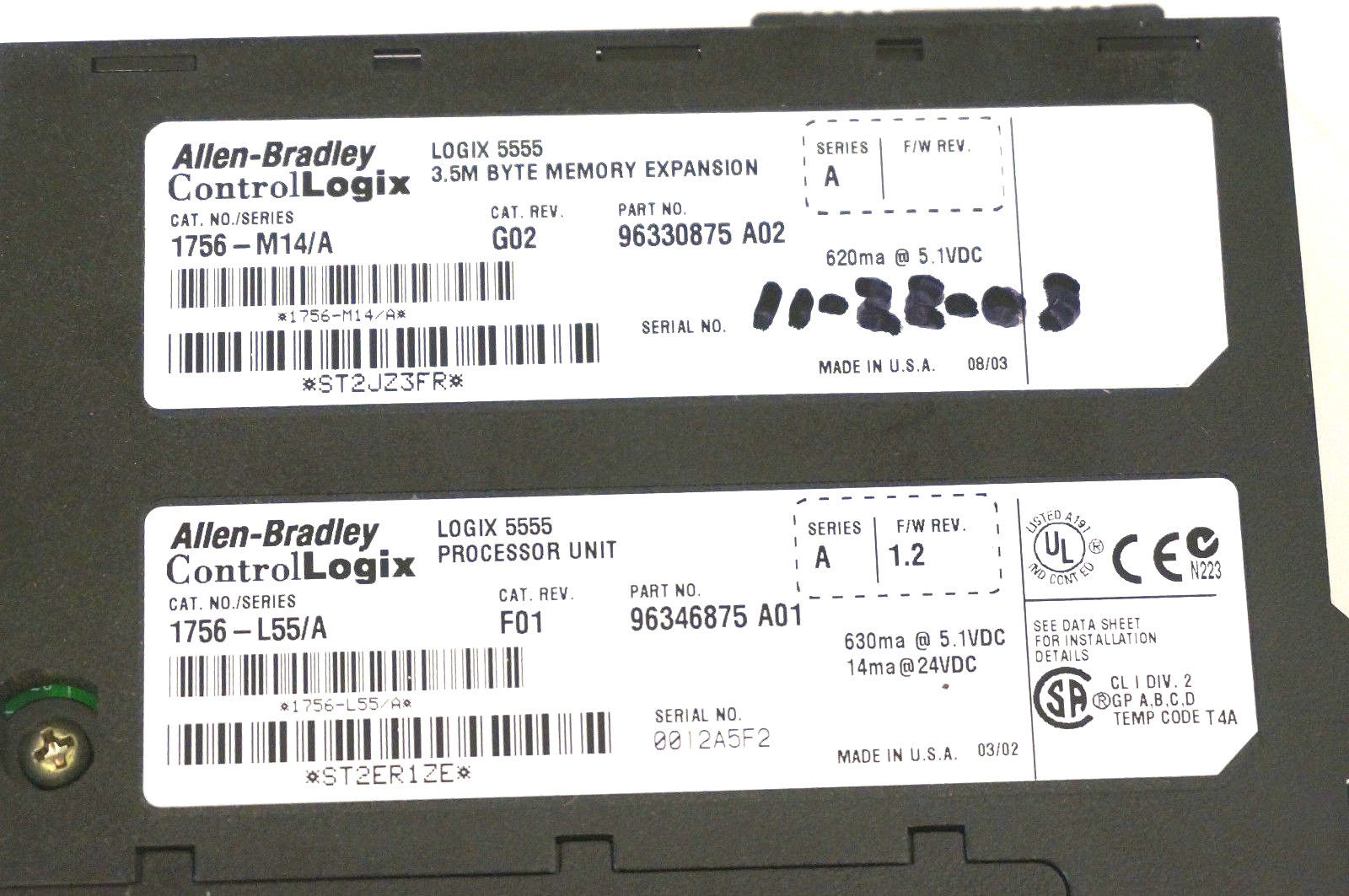 ALLEN BRADLEY 1756-L55/A PROCESSOR REV. F01 W/ 1756-M14 MEMORY SER. A 1756L55