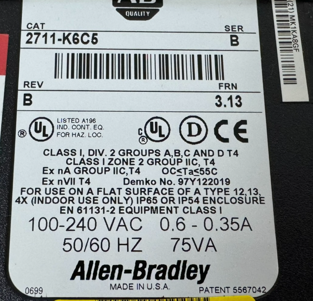 ALLEN BRADLEY 2711-K6C5 PANELVIEW 600 SER. B REV. B FRN: 3.13 REFURBISHED