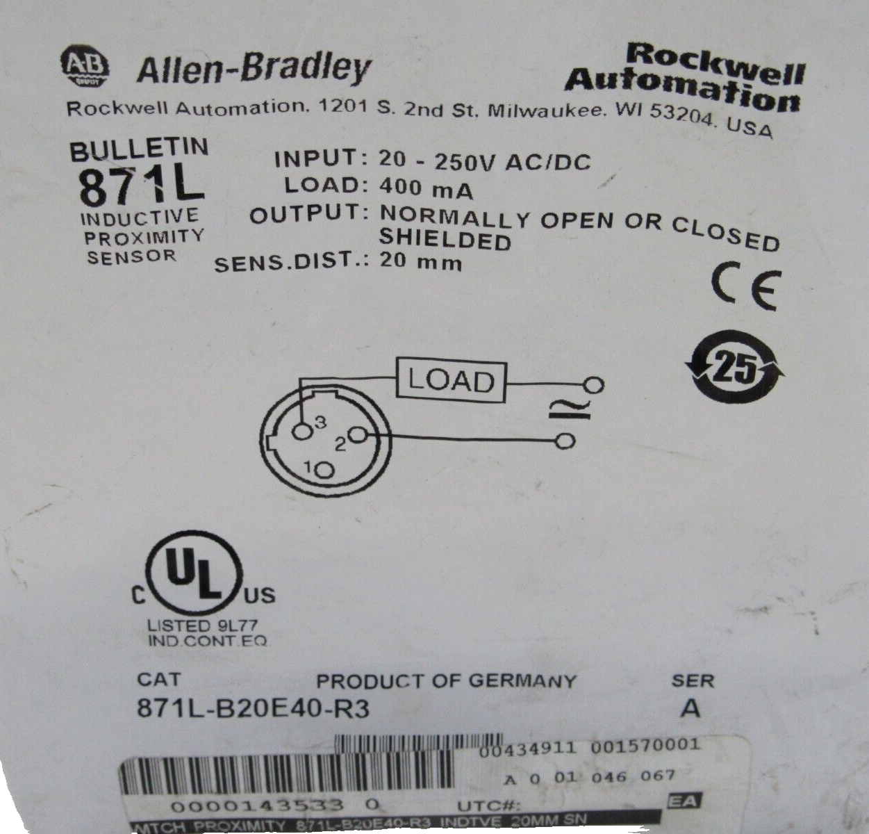 ALLEN BRADLEY 871L-B20E40-R3 PROXIMITY SWITCH 871LB20E40R3 NEW, SURPLUS