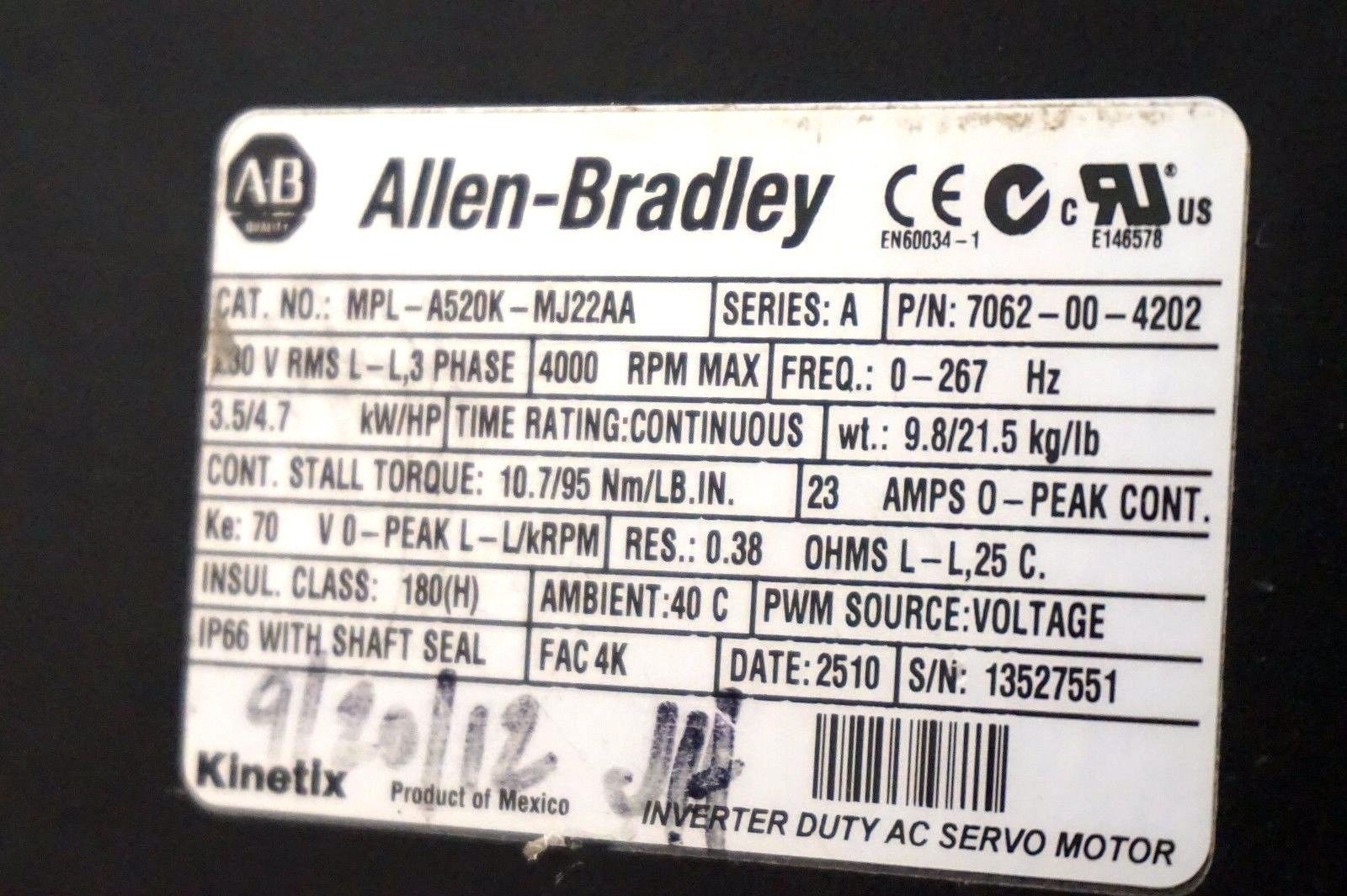 ALLEN BRADLEY MPL-A520K-MJ22AA SERIES A SERVO MOTOR 3 PHASE, 4000RPM