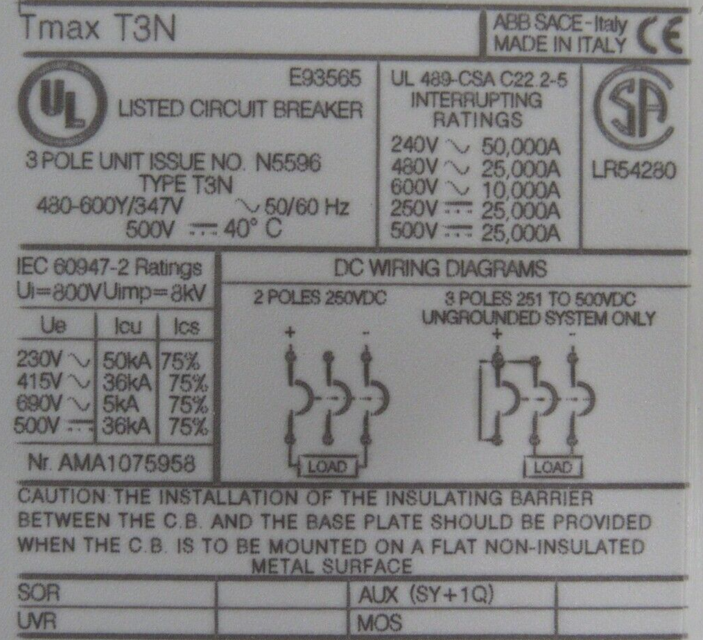 NEW ABB T3N225TWA CIRCUIT BREAKER BKR T3N 225A 3P T/M UL AS$695.00 Only 2 left in stock NEW ABB T3N225TWA CIRCUIT BREAKER BKR T3N 225A 3P T/M UL AS quantity Add to cart SKU: 354846603675 Category: Other Description Additional information Description NEW ABB T3N225TWA CIRCUIT BREAKER BKR T3N 225A 3P T/M UL AS B3/185 BB Additional information Weight 4.00 lbs Brand ABB MPN T3N225TWA We Buy New and Used Surplus Inventory - Sell to Us