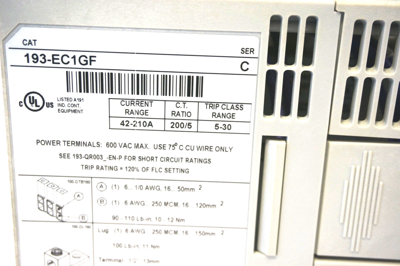 NEW ALLEN BRADLEY 193-EC1GF OVERLOAD RELAY SER.C 193EC1GF (REMOVED FROM NEW CABINET NEVER POWERED UP)
