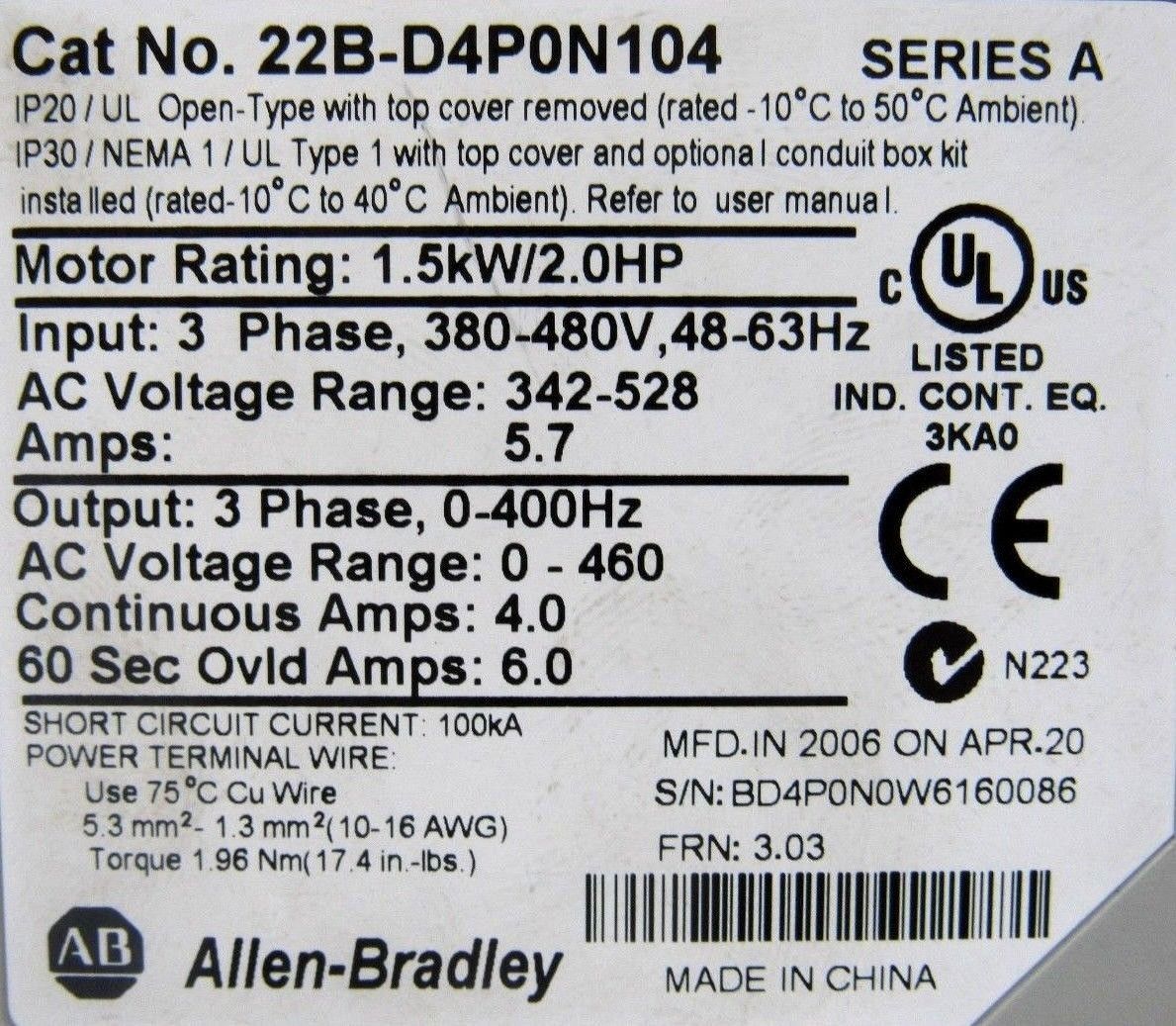 NEW ALLEN BRADLEY 22B-D4P0N104 POWERFLEX 40 DRIVE 22BD4P0N104 1.5KW 2HP SERIES ANEW, NO BOX
