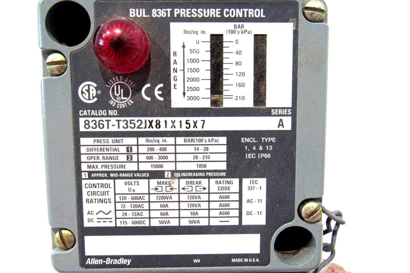 NEW ALLEN BRADLEY 836T-T352JX81X15X7 PRESSURE SWITCH 836TT352JX81X15X7