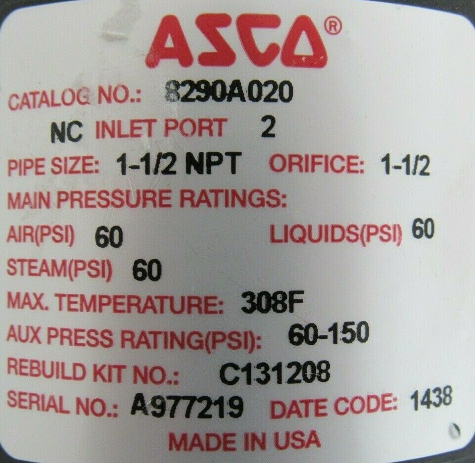 NEW ASCO 8290A020 ANGLE BODY PISTON VALVE 1-1/2″NEW, NO BOX