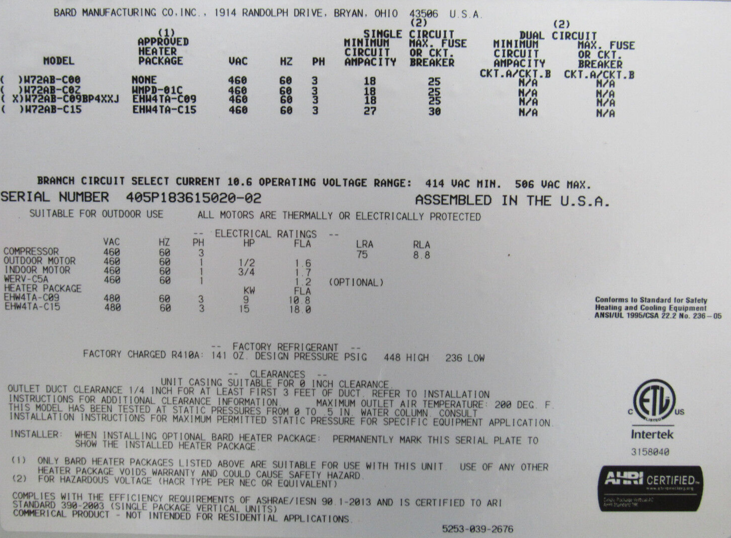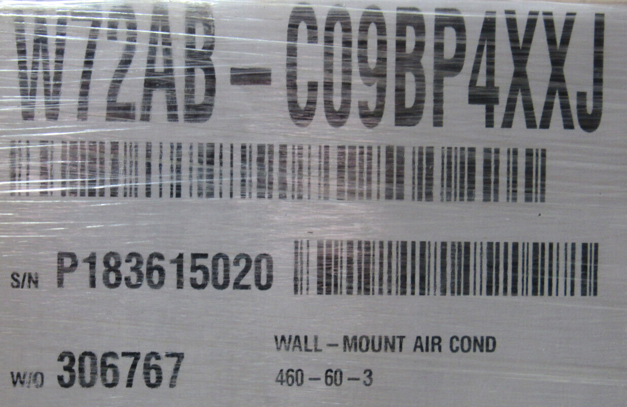 NEW BARD W72AB-C09BP4XXJ WALL MOUNT AIR CONDITIONER 460V W72ABC09BP4XXJ