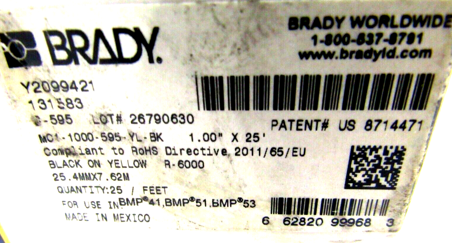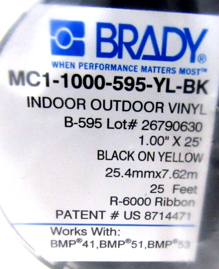 NEW BRADY MC1-1000-595-YL-BK INDOOR OUTDOOR VINYL CARTRIDGE MC11000595YLBK