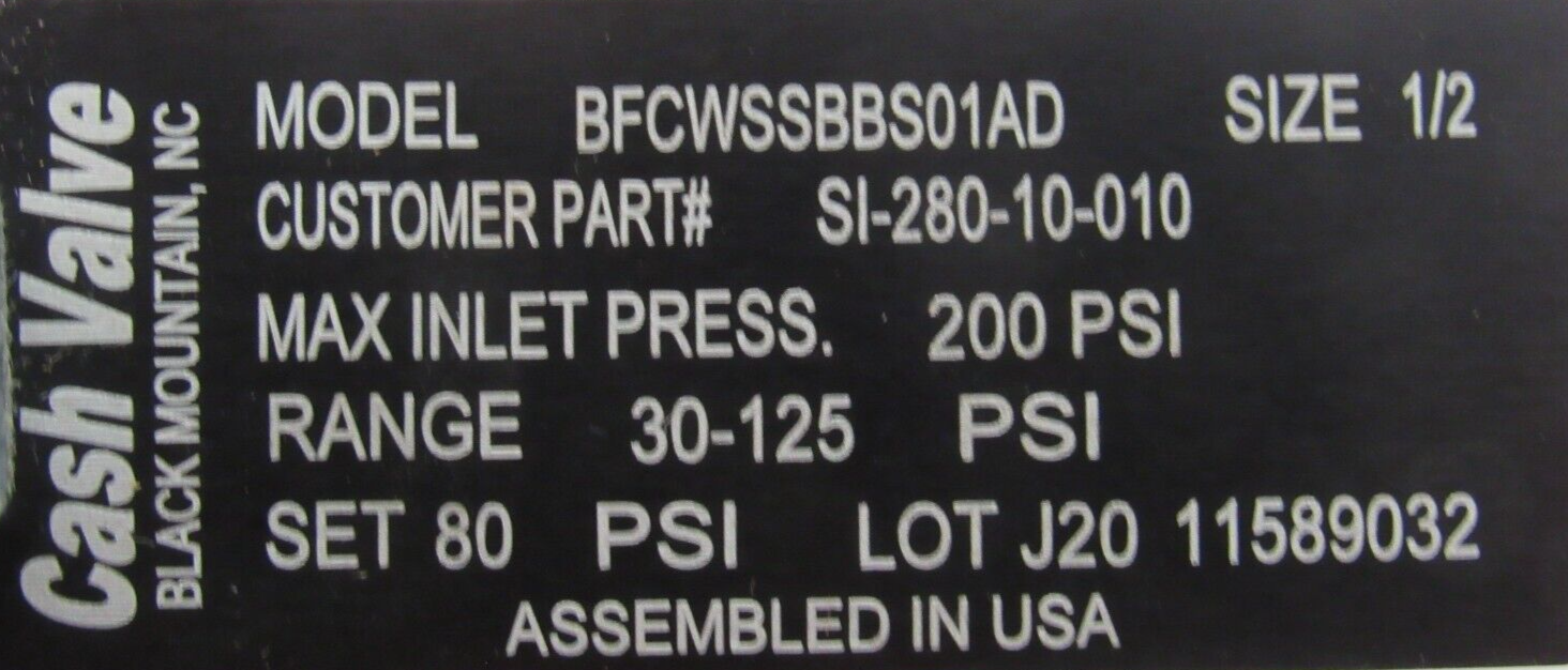 NEW CASH VALVE BFCWSSBBS01AD PRESSURE REDUCING VALVE 1/2″ SET AT 80PSI