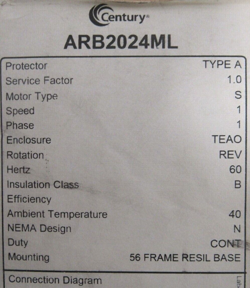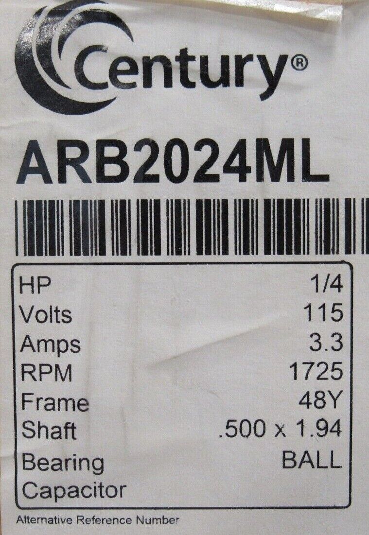 NEW CENTURY ARB2024ML MOTOR 1/4HP 1725RPM 115V S48AB41A01$160.00 Out of stock SKU: 354098589212 Category: Other Description Additional information Description NEW CENTURY ARB2024ML MOTOR 1/4HP 1725RPM 115V S48AB41A01 B3/163 BB Additional information Weight 18.00 lbs MPN ARB2024ML Brand CENTURY We Buy New and Used Surplus Inventory - Sell to Us