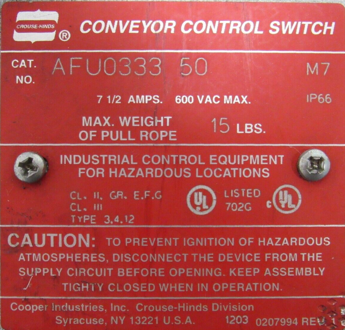 NEW CROUSE HINDS AFU0333-50 CONVEYOR CONTROL SWITCH HOUSING AFU033350NEW, NO BOX