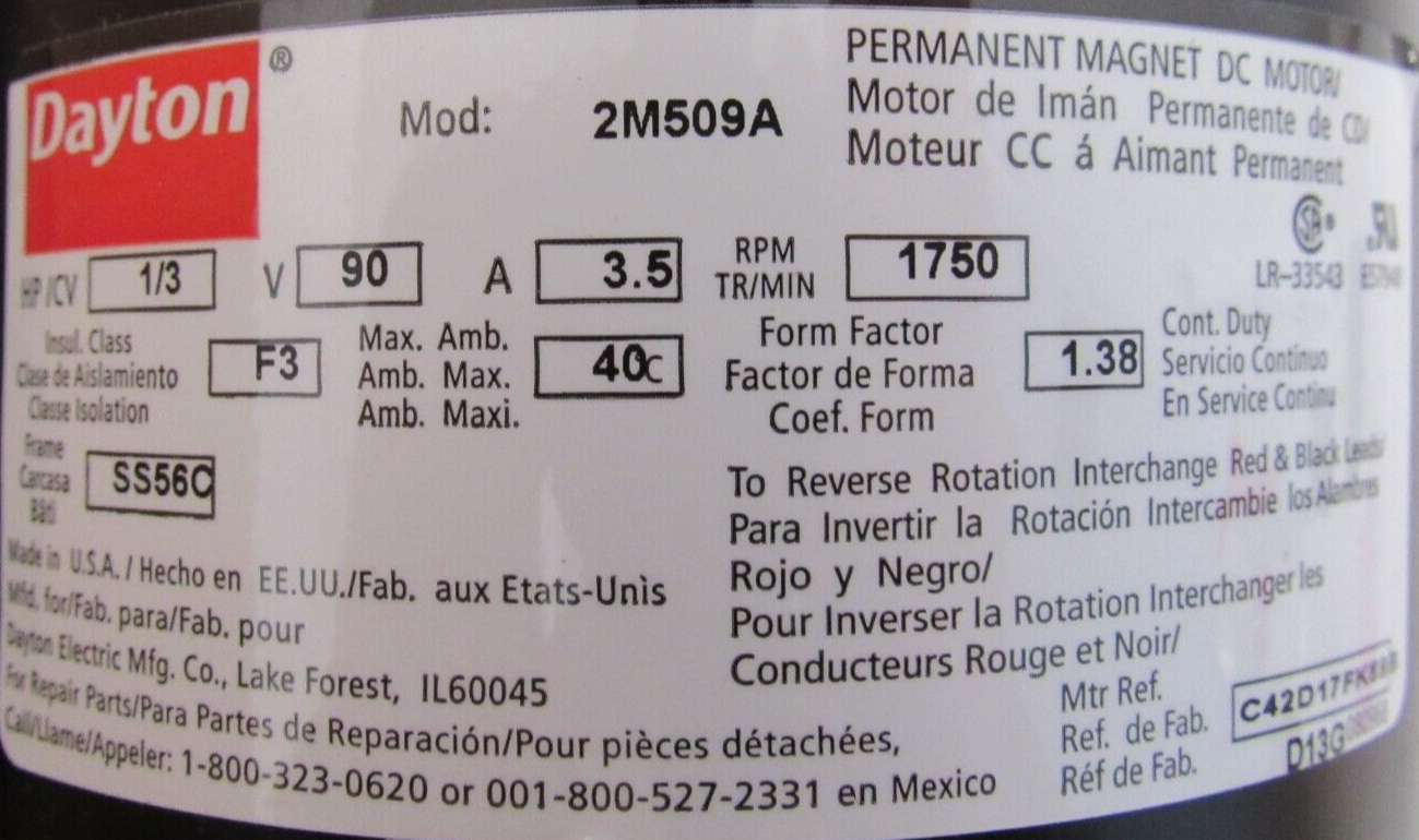 NEW DAYTON 2M509A MOTOR 90VDC 1/3HP$450.00 Out of stock SKU: 354560352850 Category: Other Description Additional information Description NEW DAYTON 2M509A MOTOR 90VDC 1/3HP B2/37 BB Additional information Weight 24.00 lbs Brand DAYTON MPN 2M509A We Buy New and Used Surplus Inventory - Sell to Us