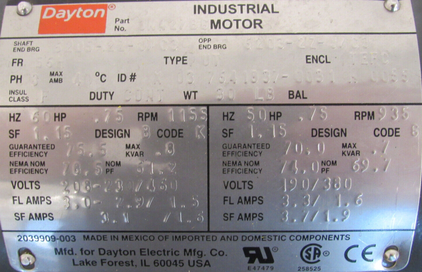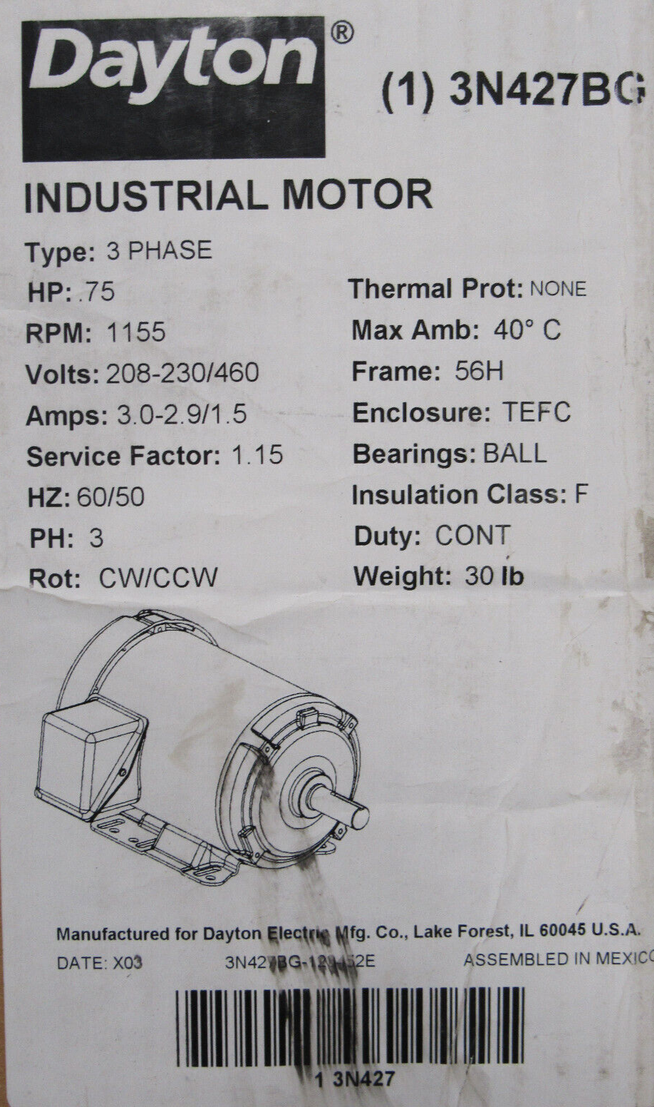 NEW DAYTON 3N427BG MOTOR .75HP 1155 RPM$240.00 Out of stock SKU: 356010861017 Category: Other Description Additional information Description NEW DAYTON 3N427BG MOTOR .75HP 1155 RPM B3/A23 BB Additional information Weight 36.00 lbs Brand DAYTON MPN 3N427BG Country/Region of Manufacture Mexico We Buy New and Used Surplus Inventory - Sell to Us