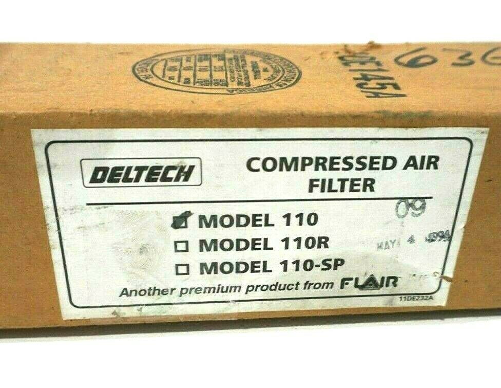 NEW DELTECH MODEL 110 COMPRESSED AIR FILTER$125.00 Out of stock SKU: 173930041494 Category: Other Description Additional information Description NEW DELTECH MODEL 110 COMPRESSED AIR FILTER 3119 RB Additional information Weight 4.00 lbs MPN 110 Brand DELTECH We Buy New and Used Surplus Inventory - Sell to Us
