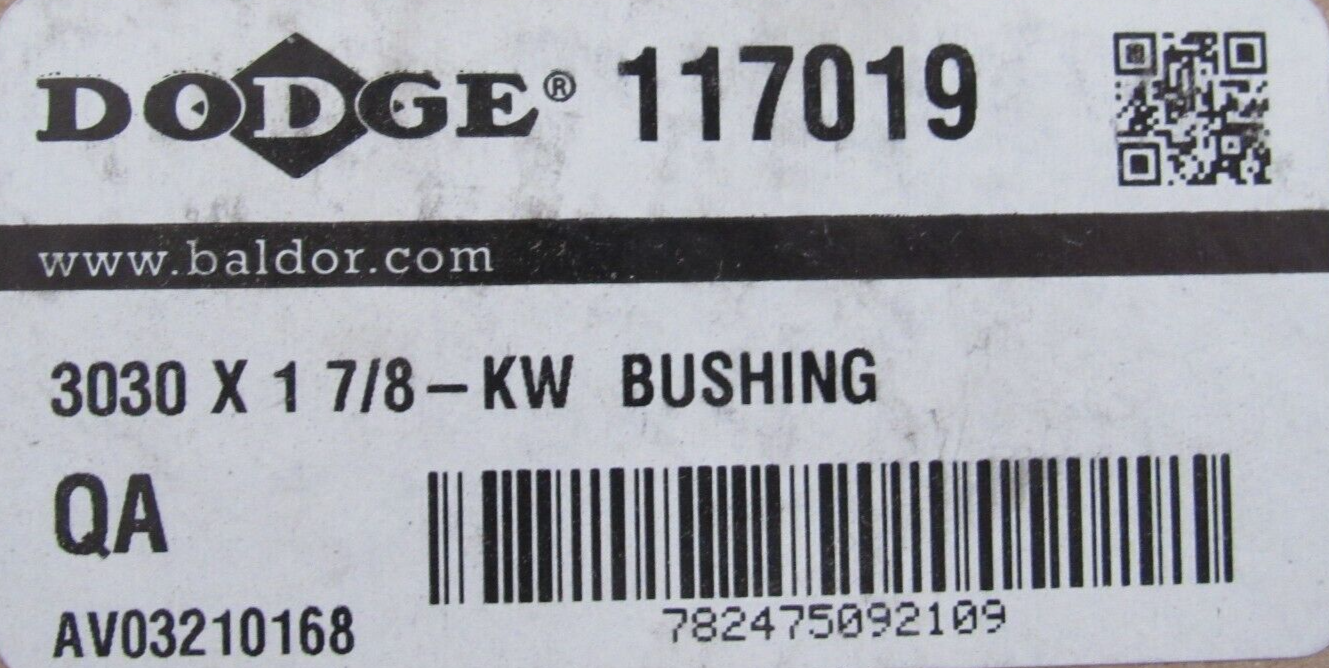 NEW DODGE 117019 TAPER LOCK BUSHING 3030 X 1 7/8-KW$35.00 Only 1 left in stock NEW DODGE 117019 TAPER LOCK BUSHING 3030 X 1 7/8-KW quantity Add to cart SKU: 354619179706 Category: Other Description Additional information Description NEW DODGE 117019 TAPER LOCK BUSHING 3030 X 1 7/8-KW B3/77 BB Additional information Weight 9.00 lbs Brand DODGE MPN 117019 We Buy New and Used Surplus Inventory - Sell to Us