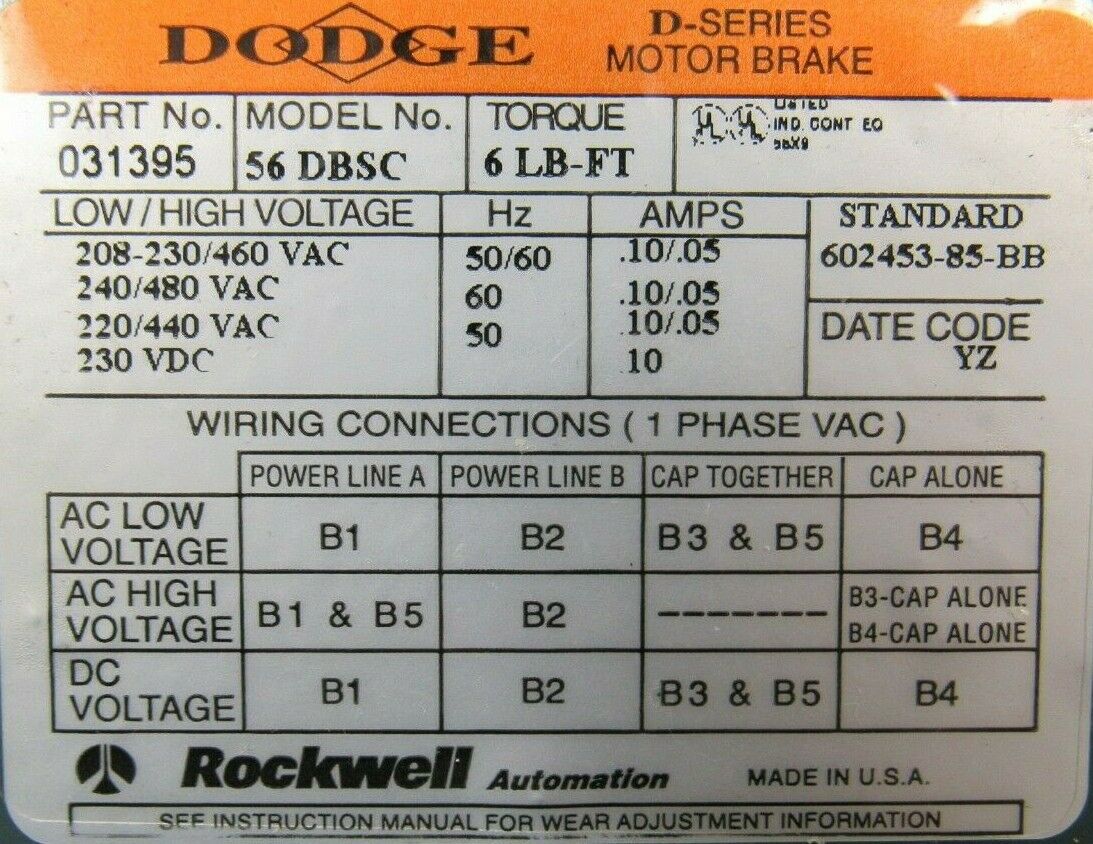 NEW DODGE 56DBSC-6-MA MOTOR BRAKE 230/460V 031395 56DBSC6MA