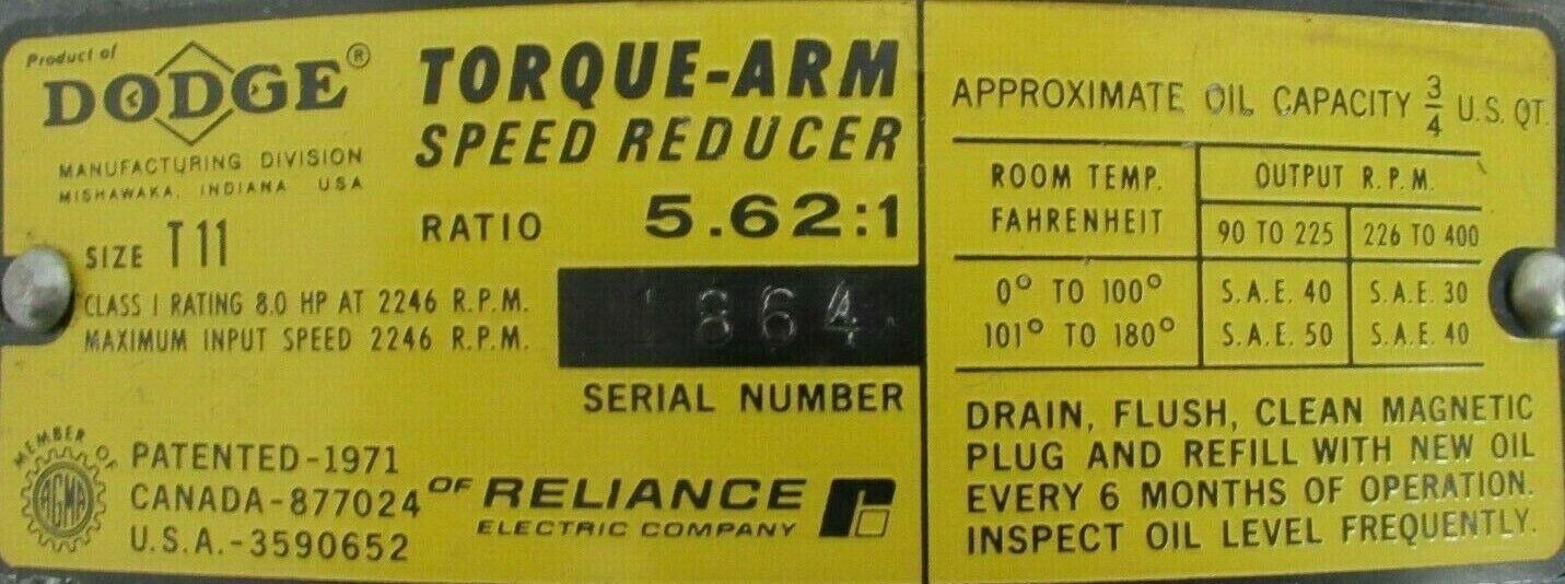 NEW DODGE T11 TORQUE-ARM SPEED REDUCER 5.62:1 1-5/8" BORE$650.00 Out of stock SKU: 193933179639 Category: Other Description Additional information Description NEW DODGE T11 TORQUE-ARM SPEED REDUCER 5.62:1 1-5/8″ BORENEW, NO BOX B3/128 BB Additional information Weight 35.00 lbs MPN T11 Brand DODGE We Buy New and Used Surplus Inventory - Sell to Us