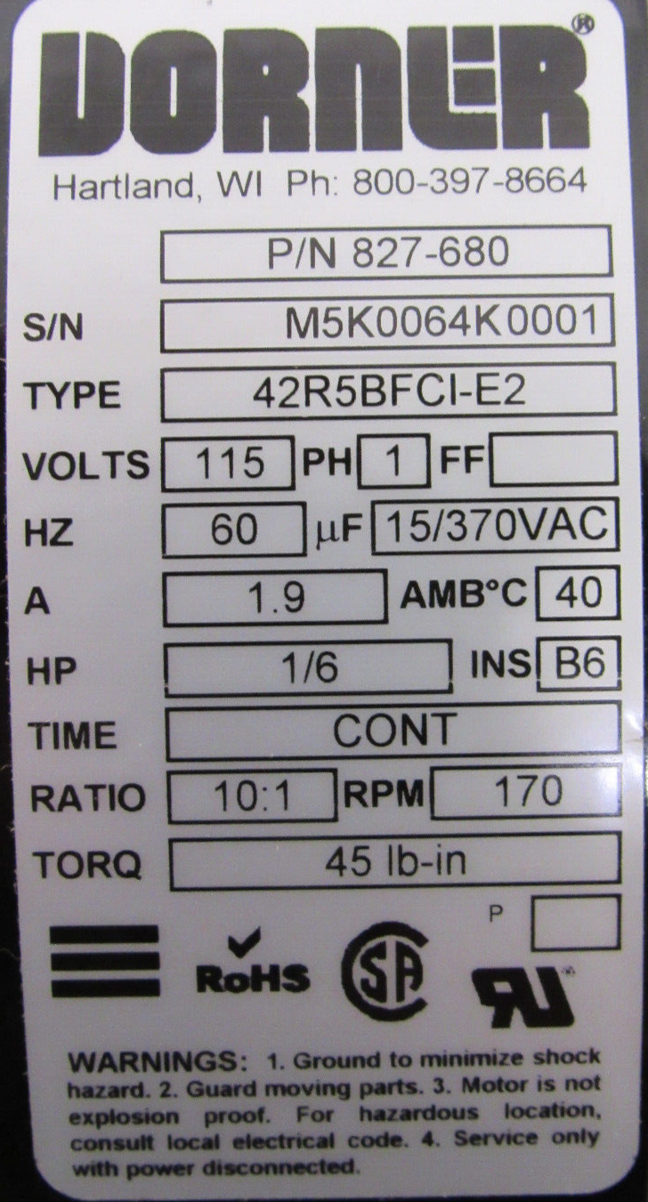 NEW DORNER 62M010PS411FN GEARMOTOR 10:1 42R5BFC1-E2 827-680