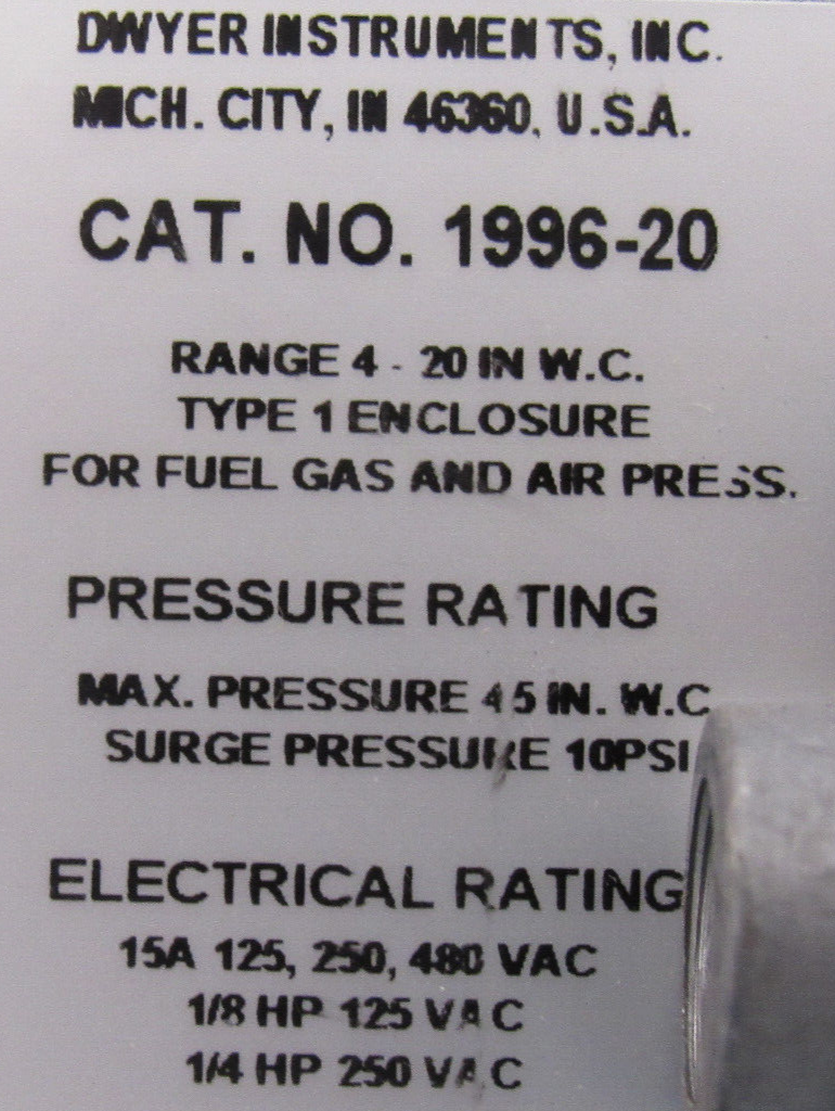 NEW DWYER 1996-20 PRESSURE SWITCH 1900 SERIES 199620$120.00 Out of stock SKU: 354904748318 Category: Other Description Additional information Description NEW DWYER 1996-20 PRESSURE SWITCH 1900 SERIES 199620 2025 BB Additional information Weight 1.00 lbs Brand DWYER MPN 1996-20 We Buy New and Used Surplus Inventory - Sell to Us