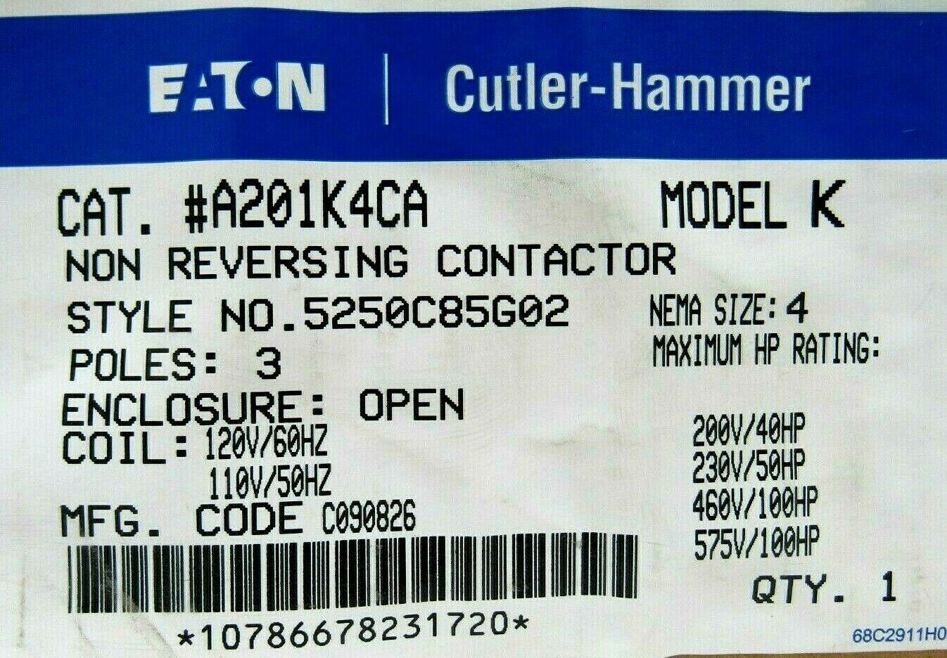 NEW EATON A201K4CA NON REVERSING CONTACTOR MODEL K 3 POLE SIZE 4 5250C85G02