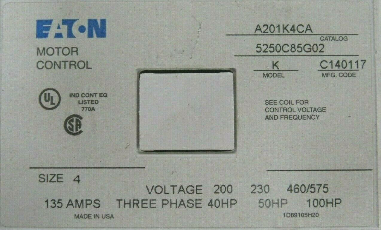 NEW EATON A201K4CA NON REVERSING CONTACTOR SIZE 4 MODEL K 5250C85G02