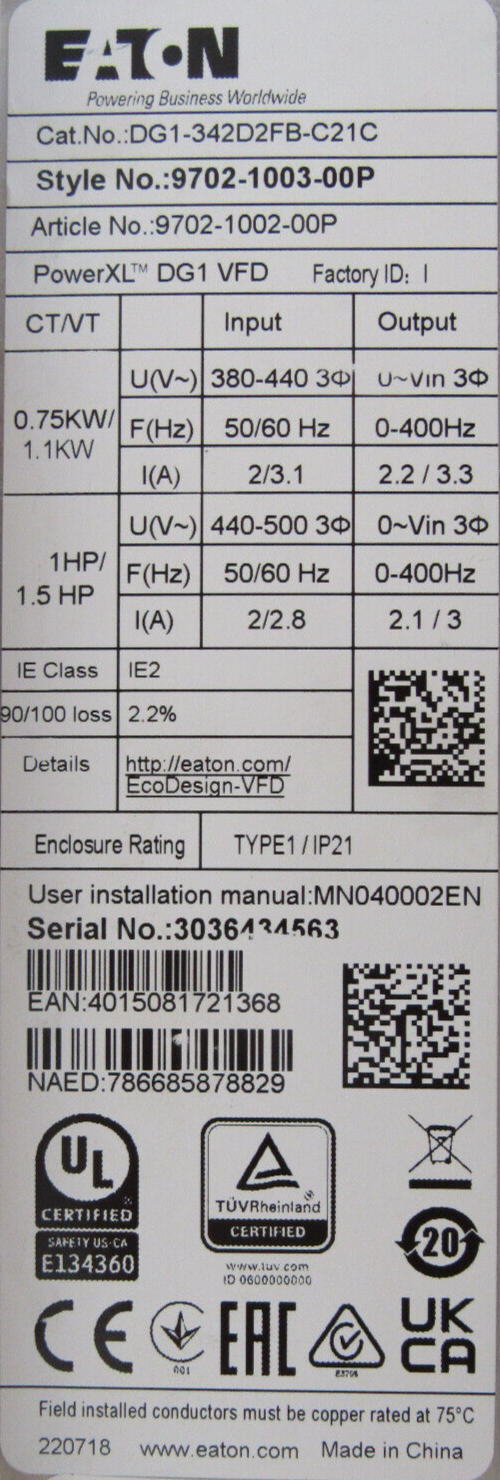 NEW EATON DG1-342D2FB-C21C DRIVE 1 HP DG1342D2FBC21C