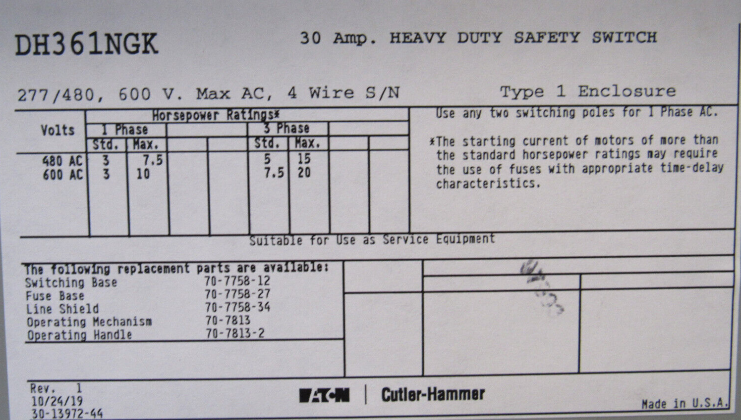 NEW EATON DH361NGK SAFETY SWITCH 30A 600V