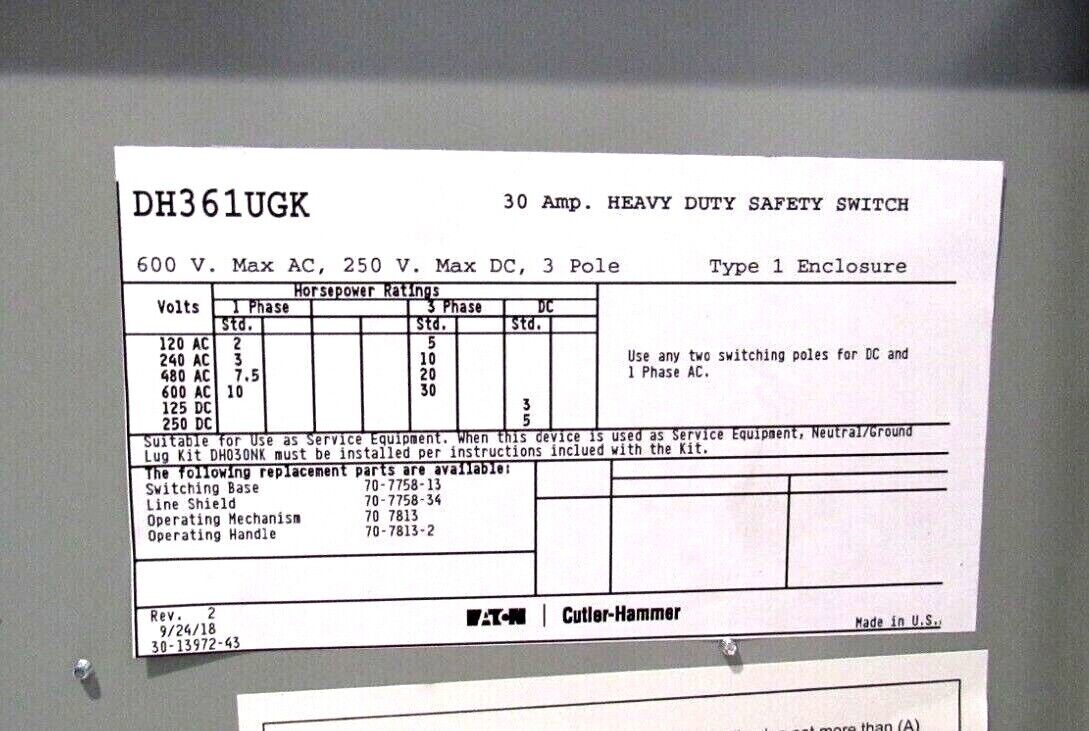 NEW EATON DH361UGK SAFETY SWITCH 3 POLE 600V 30 AMP$100.00 Only 1 left in stock NEW EATON DH361UGK SAFETY SWITCH 3 POLE 600V 30 AMP quantity Add to cart SKU: 195138579615 Category: Other Description Additional information Description NEW EATON DH361UGK SAFETY SWITCH 3 POLE 600V 30 AMP NEW, NO BOX B1/S-35 RB Additional information Weight 11.44 lbs MPN DH361UGK Brand EATON We Buy New and Used Surplus Inventory - Sell to Us