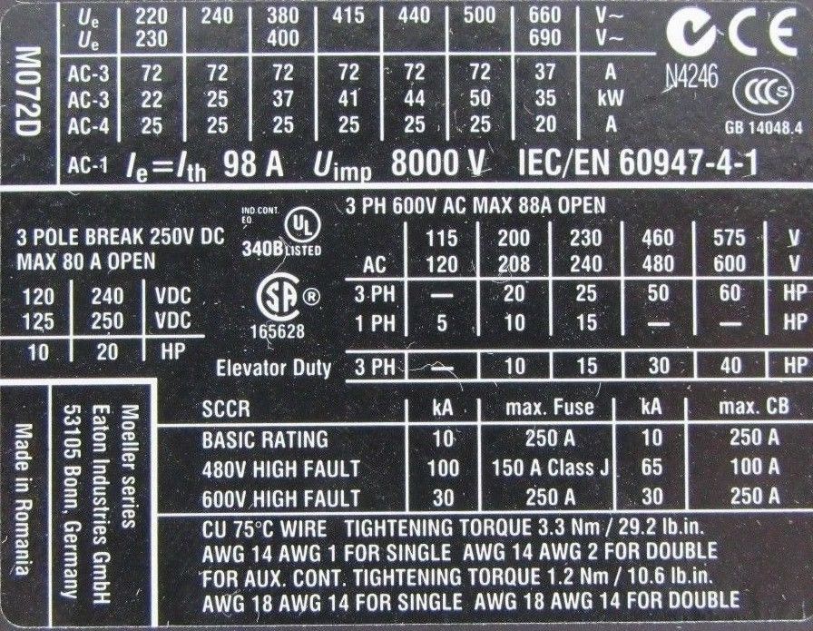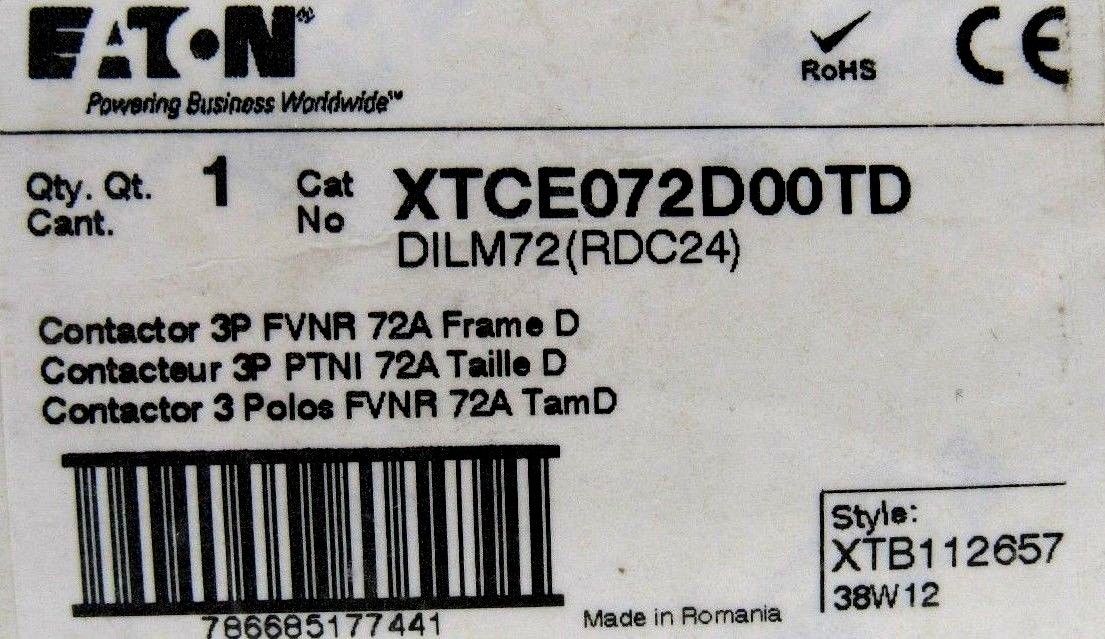NEW EATON XTCE072D00TD CONTACTOR 3P FVNR 72A FRAME D 24-27VDC