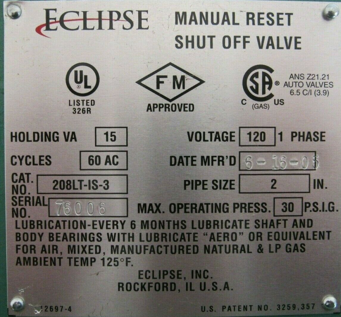 NEW ECLIPSE 208LT-IS-3 SAFETY SHUT-OFF VALVE 200LT 2″ 208LTIS3