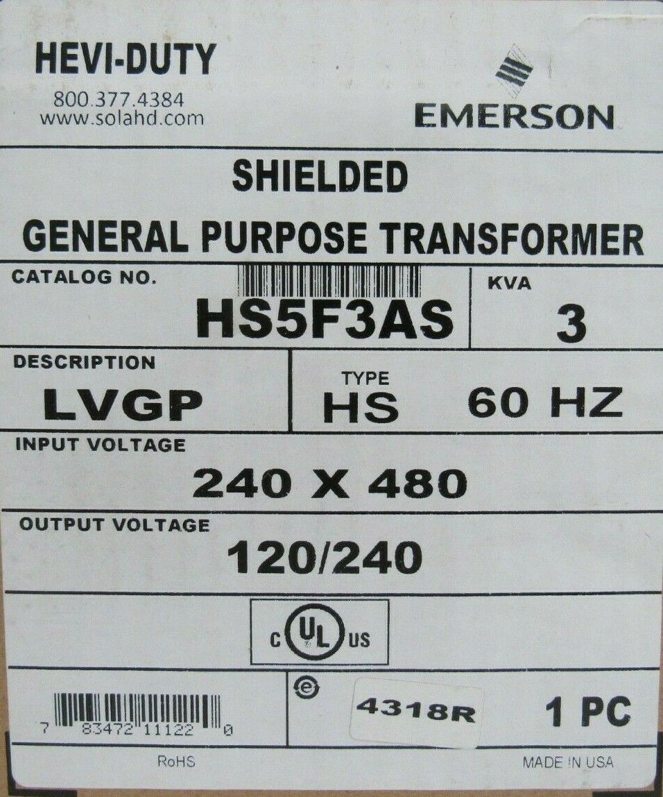 NEW EMERSON HS5F3AS TRANSFORMER IN: 240x480V OUT: 120x240V