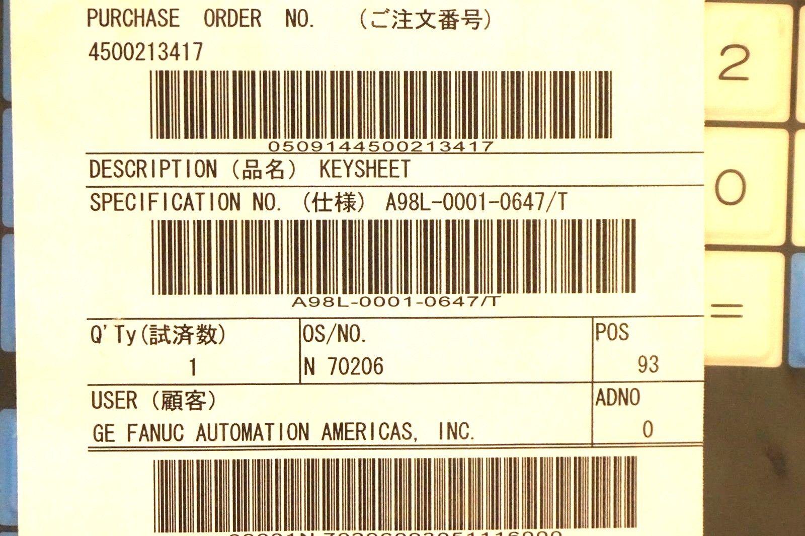 NEW FANUC A98L-0001-0647 / T MEMBRANE KEYSHEET A98L00010647T NEW, NO BOX