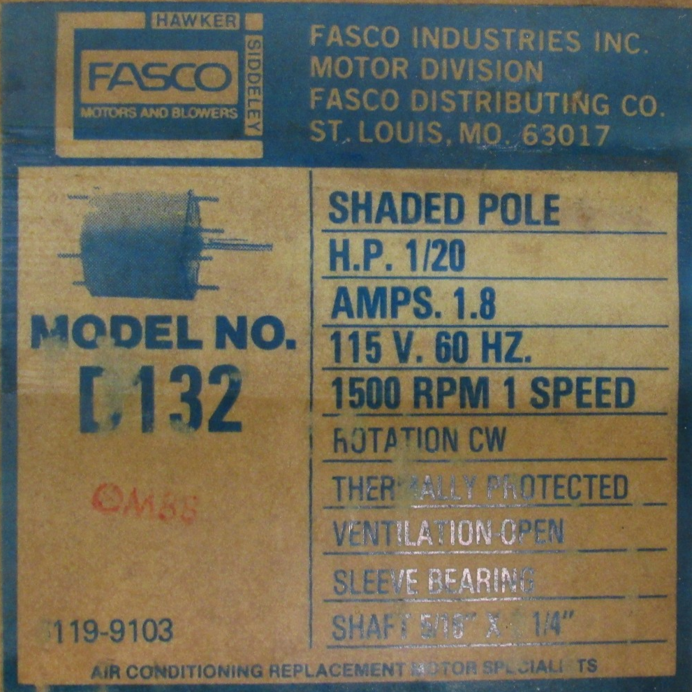 NEW FASCO D132 MOTOR 1/20HP 1500RPM 115V$60.00 Out of stock SKU: 357464570945 Category: Other Description Additional information Description NEW FASCO D132 MOTOR 1/20HP 1500RPM 115V B3/152 BB Additional information Weight 4.00 lbs Brand Fasco MPN D132 Country/Region of Manufacture United States We Buy New and Used Surplus Inventory - Sell to Us
