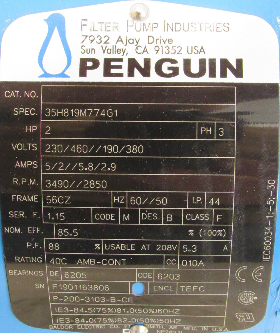 NEW FILTER PUMP INDUSTRIES P-2 PUMP MOTOR PENGUIN 2HP 230/460V 56CZ