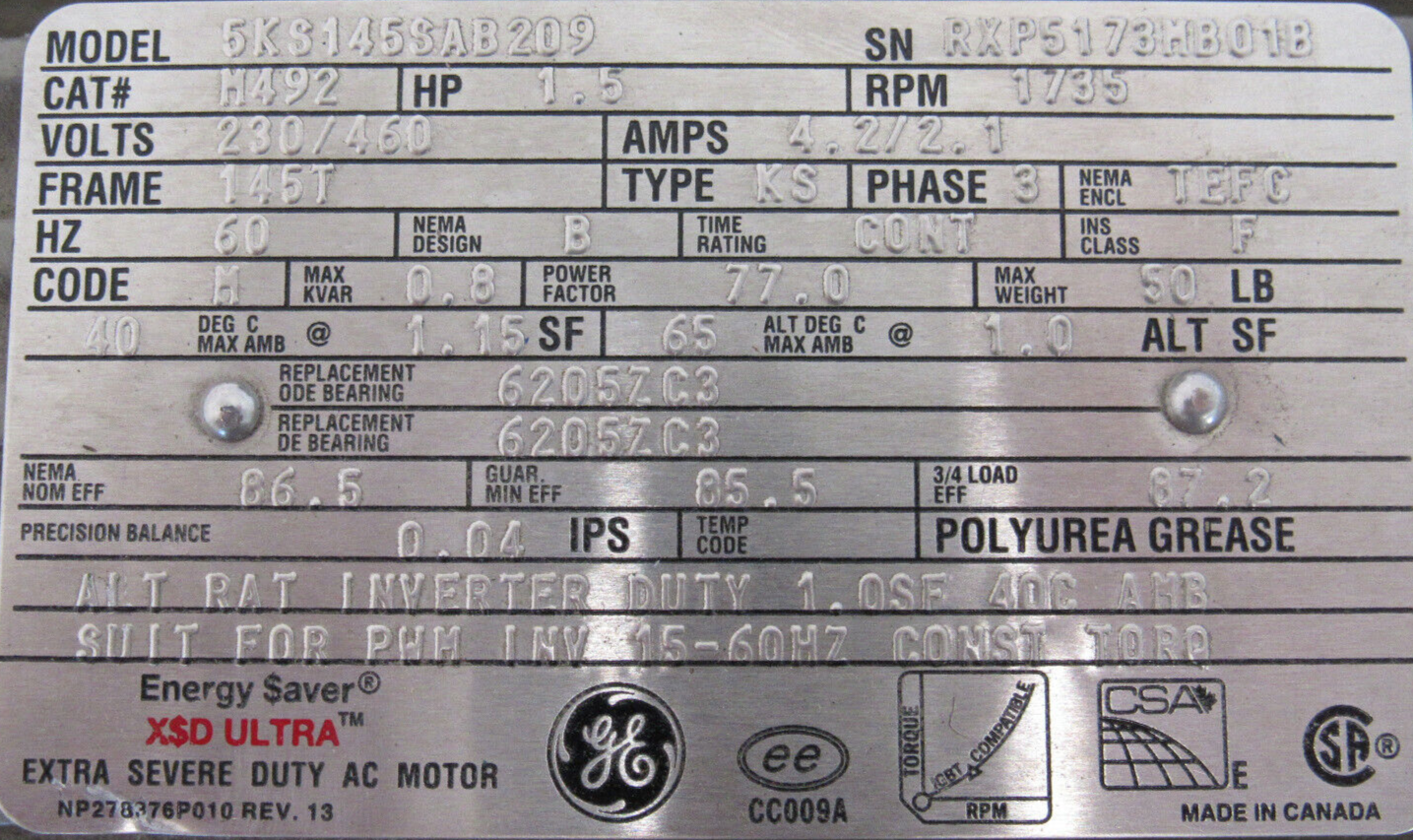 NEW GENERAL ELECTRIC M492 MOTOR 1.5HP 230/460V 145T 1735RPM 5KS145SAB209NEW, NO BOX