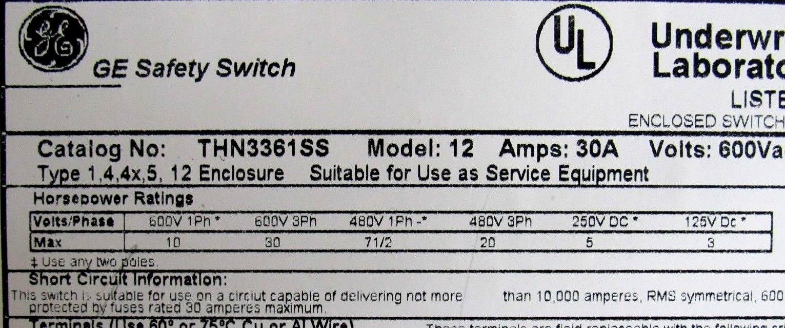 NEW GENERAL ELECTRIC THN3361SS SAFETY SWITCH 600V 30A 3 POLES
