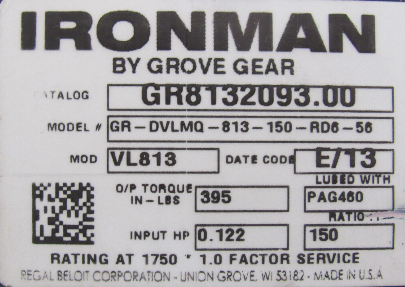 NEW GROVE GEAR GR8132093.00 GEAR REDUCER 150:1 GR-DVLMQ-813-150-RD6-56NEW, NO BOX