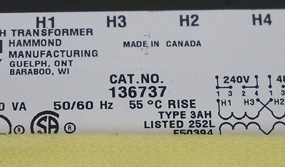 NEW HAMMOND MANUFACTURING TRR00014 TRANSFORMER 240-480V, 250VA, 136737