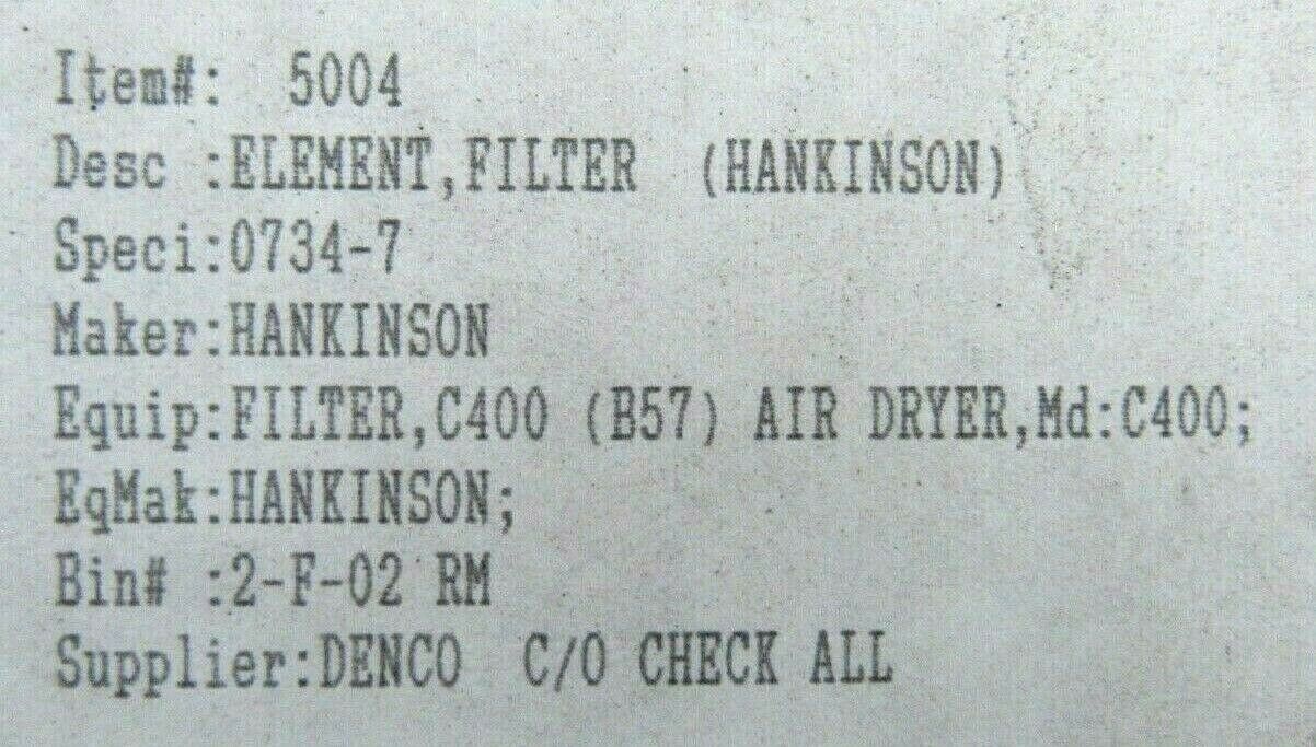 NEW HANKINSON 0734-7 FILTER ELEMENT 5004 07347$60.00 Only 1 left in stock NEW HANKINSON 0734-7 FILTER ELEMENT 5004 07347 quantity Add to cart SKU: 174253876081 Category: Other Description Additional information Description NEW HANKINSON 0734-7 FILTER ELEMENT 5004 07347 B3/S67 BB Additional information Weight 3.00 lbs MPN 0734-7 Brand HANKINSON We Buy New and Used Surplus Inventory - Sell to Us