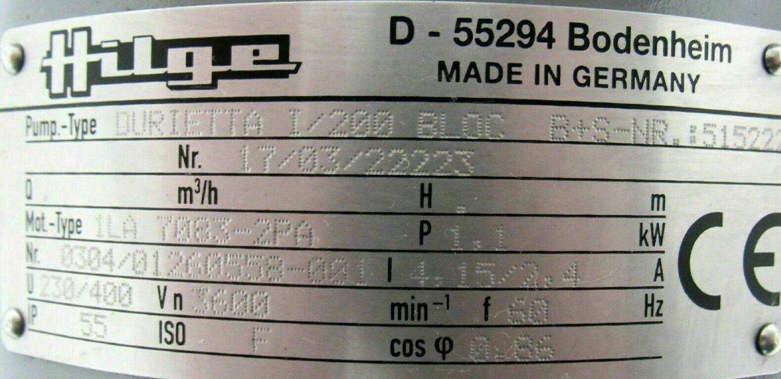 NEW HILGE DURIETTA I/200 BLOC PUMP 1LA7083-2PA99-Z 17/0