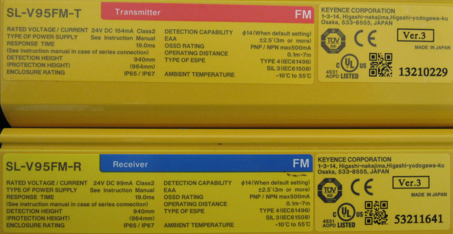 NEW KEYENCE SL-V95FM-T TRANSMITTER AND SL-V95FM-R RECEIVER LIGHT CURTAIN SET