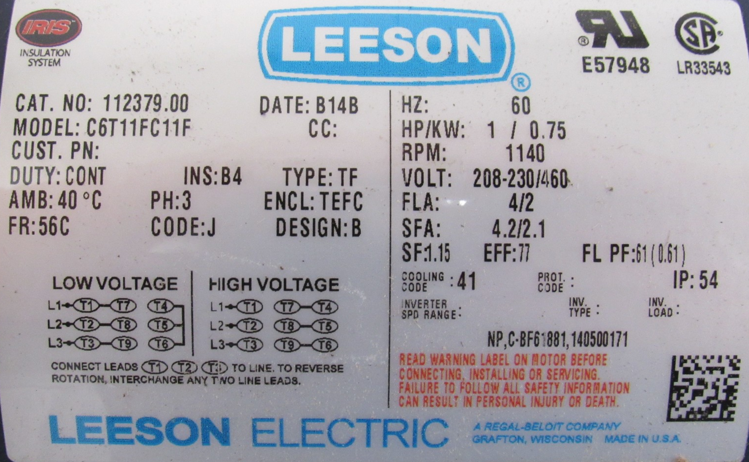 NEW LEESON 112379.00 MOTOR 1HP 208-230/460V 1140RPM 5/8" DIA. C6T11FC11F