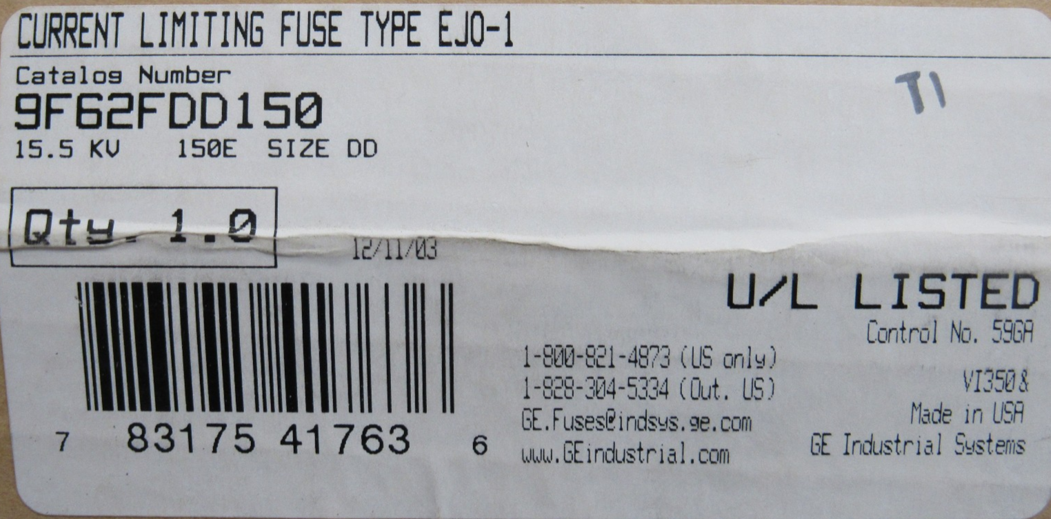 NEW LOT OF 3 GE 9F62FDD150 CURRENT LIMITING FUSE 15.5KV 150E DD