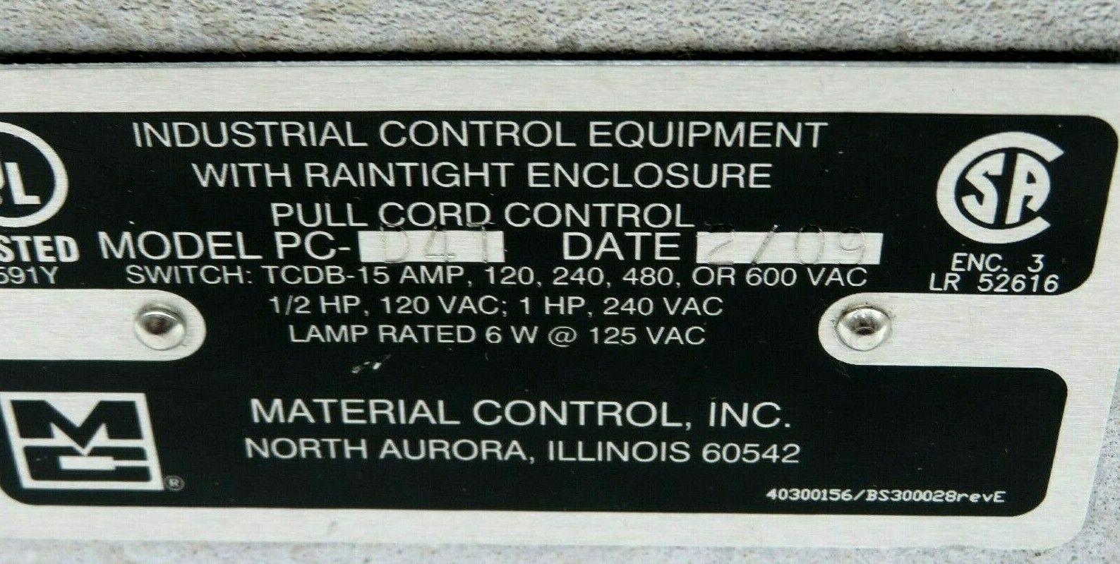 NEW MATERIAL CONTROL INC. PC-D4T PULL CORD CONTROL SWITCH 1/2 HP 120VAC PCD4T