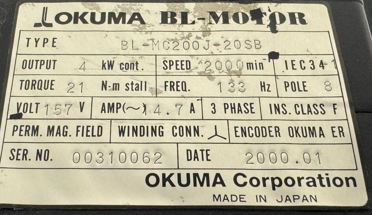 NEW OKUMA BL-MC200J-20SB SERVO MOTOR 2000RPM 133HZ 8P 157V 14.7A BLMC200J20SB