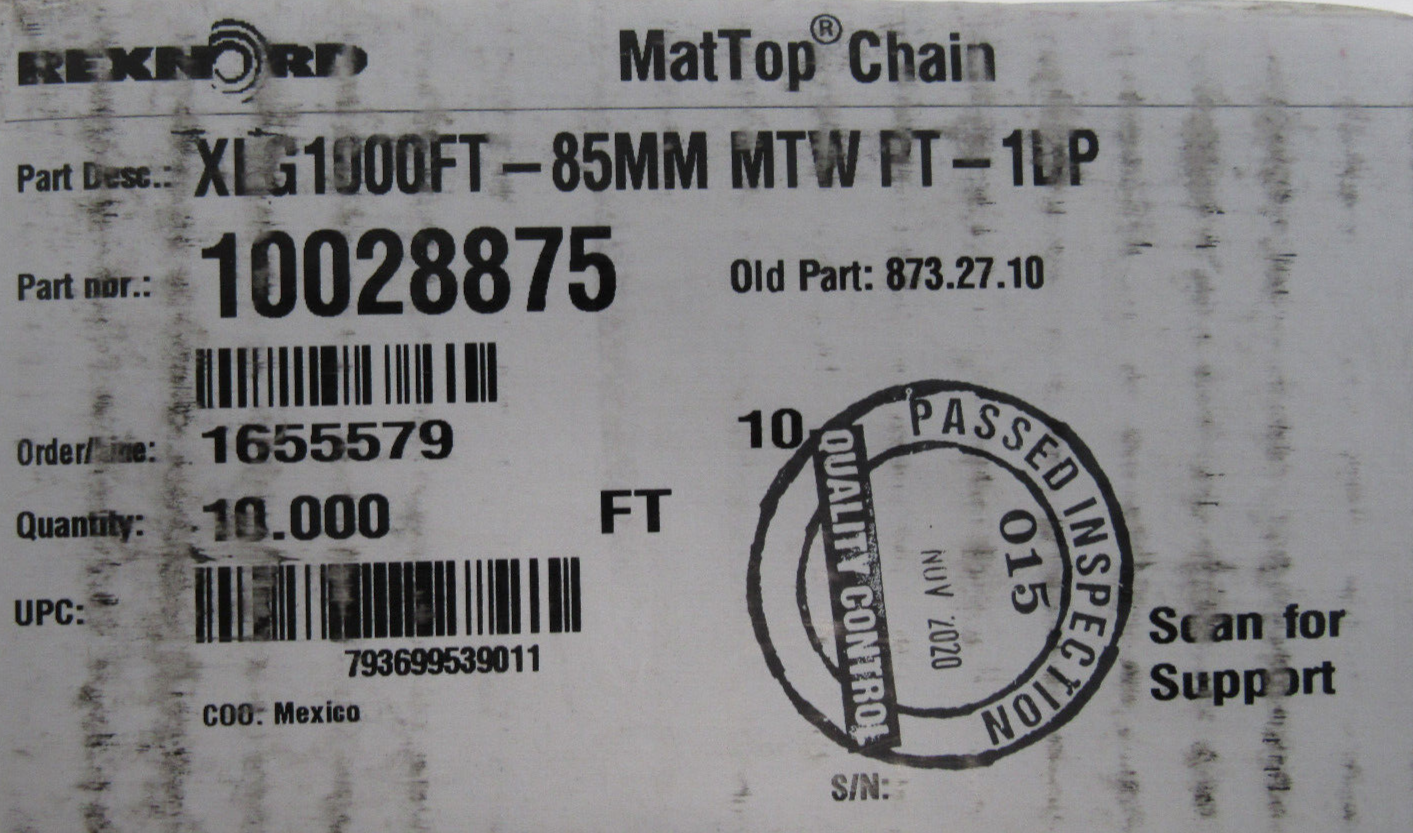 NEW REXNORD 10028875 TABLETOP CHAIN XLG1000FT-85MM MTW 10FT$120.00 Only 2 left in stock NEW REXNORD 10028875 TABLETOP CHAIN XLG1000FT-85MM MTW 10FT quantity Add to cart SKU: 196197220218 Category: Other Description Additional information Description NEW REXNORD 10028875 TABLETOP CHAIN XLG1000FT-85MM MTW 10FT B3/48 BB Additional information Weight 5.00 lbs Brand REXNORD MPN 10028875 We Buy New and Used Surplus Inventory - Sell to Us