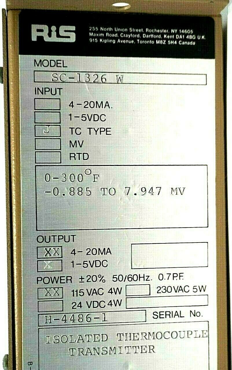 NEW RIS SC-1326 W THERMOCOUPLE TRANSMITTER SC1326W$125.00 Out of stock SKU: 352609098221 Category: Other Description Additional information Description NEW RIS SC-1326 W THERMOCOUPLE TRANSMITTER SC1326W NEW, NO BOX 3061 RB Additional information Weight 4.00 lbs Brand RIS MPN SC-1326 W We Buy New and Used Surplus Inventory - Sell to Us