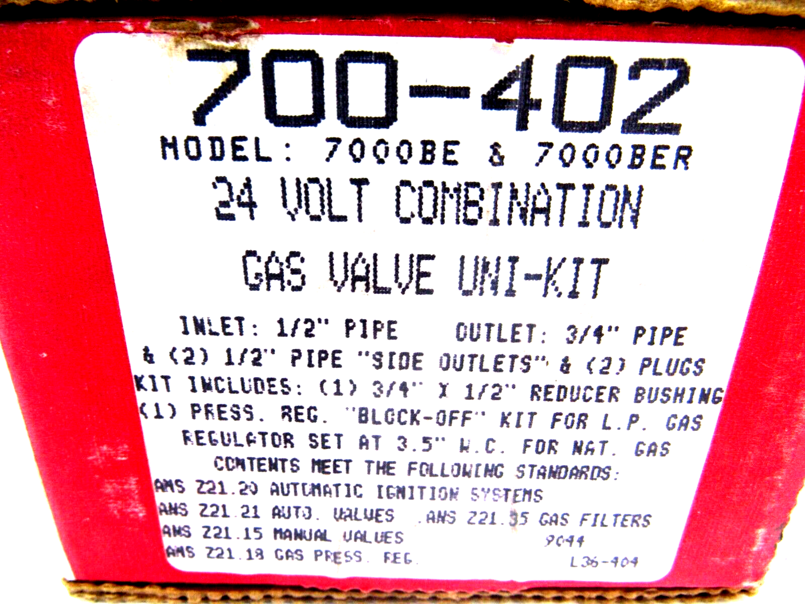 NEW ROBERTSHAW 700-402 GAS VALVE UNI-KIT 700402$100.00 Out of stock SKU: 195929094843 Category: Other Description Additional information Description NEW ROBERTSHAW 700-402 GAS VALVE UNI-KIT 700402625/BF Additional information Weight 3.00 lbs Brand ROBERTSHAW Type Gas Valve MPN 700-402 We Buy New and Used Surplus Inventory - Sell to Us